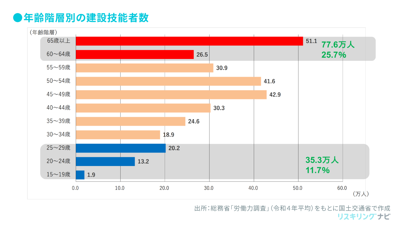 年齢階層別の建設技能者(現場で作業に従事する労働者)の数を見ると、60歳以上の技能者は77.6万人と全体の約4分の1(25.7%)を占めており、20代以下は35.3万人と約1割(11.7%)に過ぎません。60歳以上の技能者の大半が10年後に引退すると考えれば、若手技能者の確保・育成が望まれるところです。
