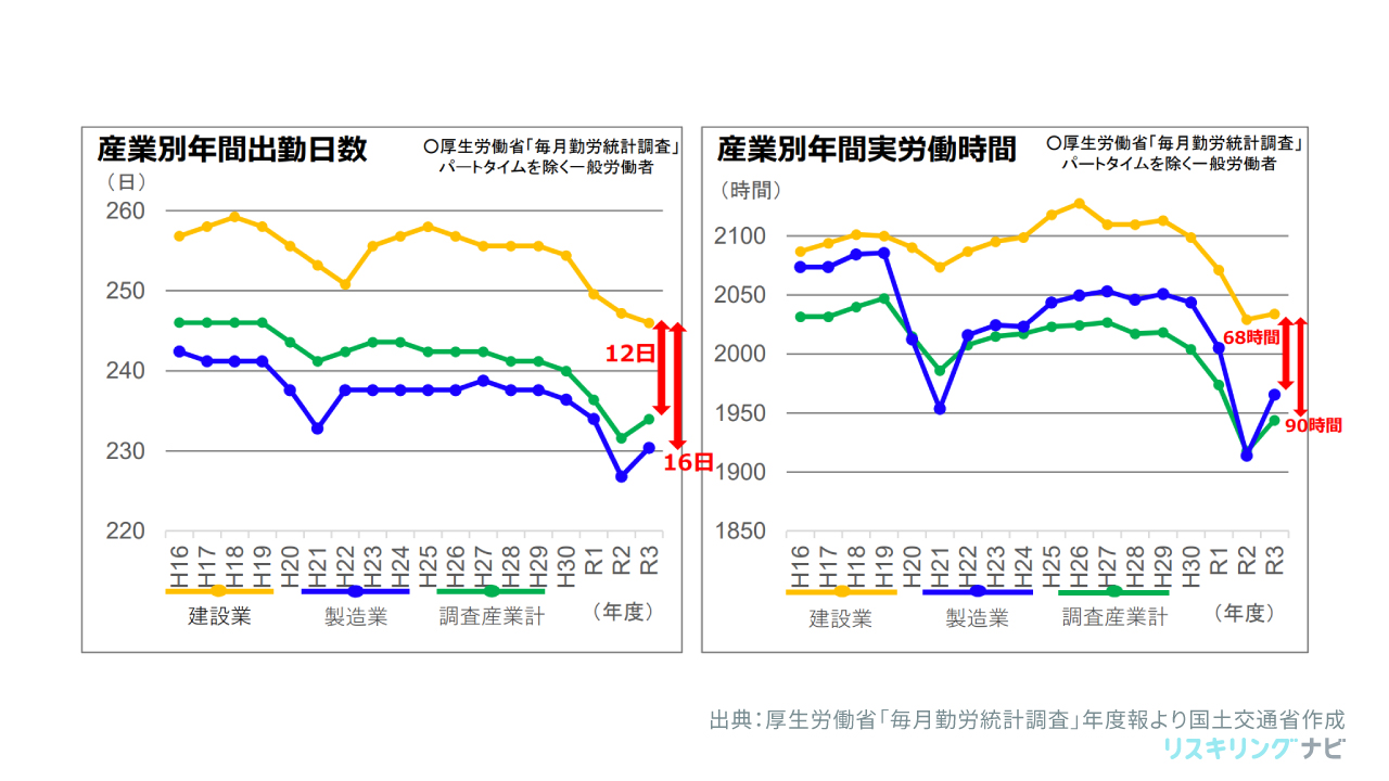 長時間労働も大きな課題の一つです。建設業界の年間出勤日数は以前は250~260日でしたが、近年は240~250日と減少傾向にあります。それでも、建設業界は他の産業と比較すると出勤日数が多い傾向にあります。建設業界の年間実労働時間はこれまでより短くなっていますが、全産業と比較して90時間長く(2022年時点)、労働時間の減少があまり進んでいないことが分かります。