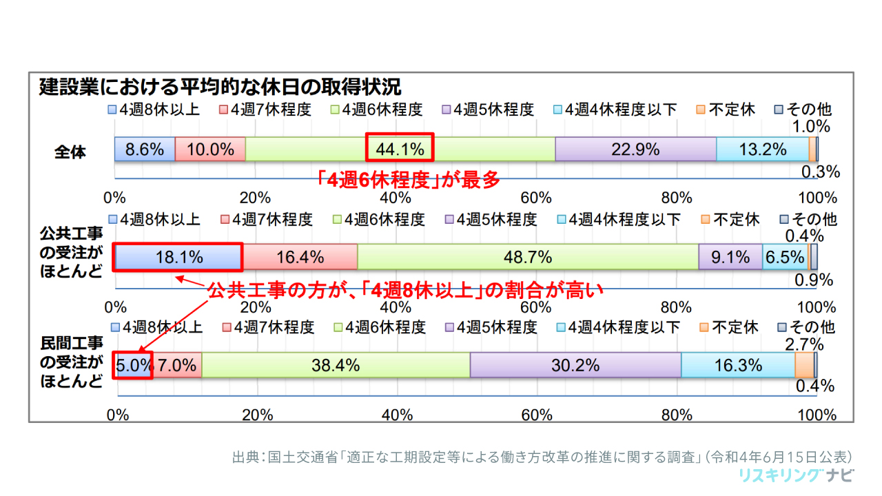 週休2日が一般的な働き方であるのに対し、建設業界は4週6休程度が44.1%と最も多く、4週8休以上は8.6%にとどまっています。また、公共工事の受注が大半を占める場合は4週8休以上が18.1%であるのに対し、民間工事主体の場合は5.0%と、工事が公共か民間かによっても休みの取りやすさは異なるようです。