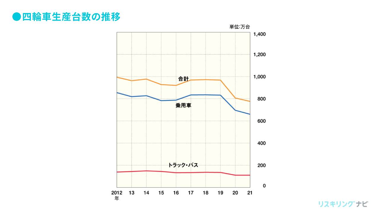 一般社団法人日本自動車工業会が発表したデータによれば、2021年の四輪車生産台数は784万7000台(前年比2.7%減)で、2018年以来3年連続で減少している状況にあります。