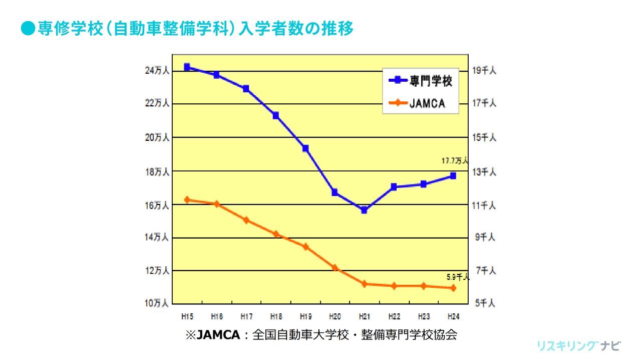 たとえば、自動車整備士を志望する若者の減少が顕著で、自動車整備学科のある専修学校への入学者数は2003年から2016年にかけて半減しています。