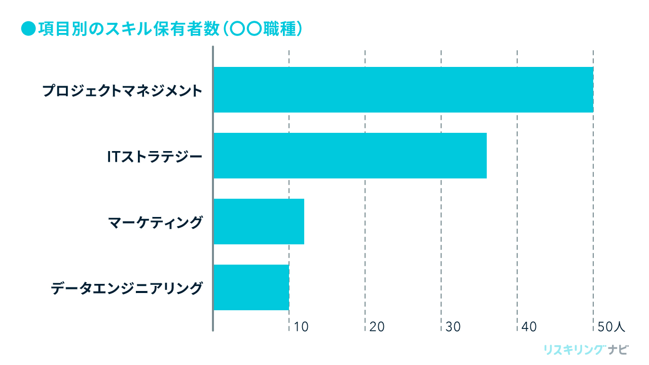 たとえば以下の図は、とある職種のデジタルスキルを項目別にグラフ化した例です。図を見ると、プロジェクトマネジメントのスキルを持った従業員が多い一方で、マーケティングやデータエンジニアリングに関する知見がある人材は少ないと分かります。