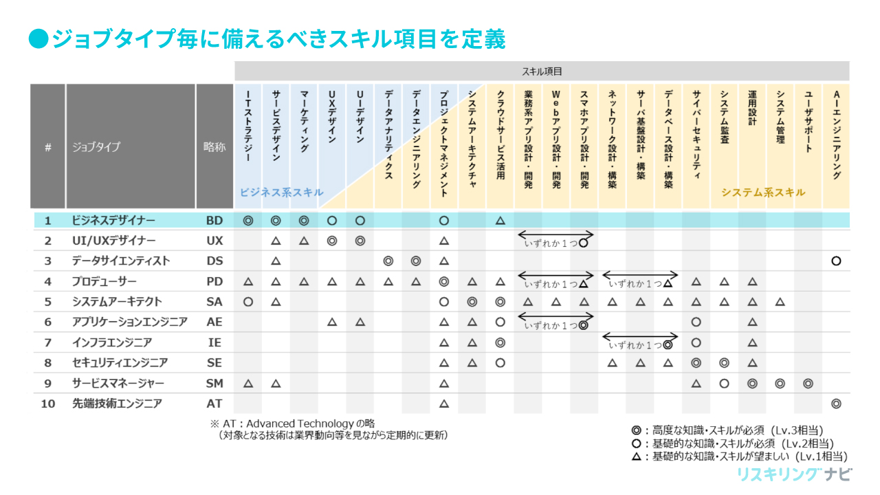 それぞれのジョブタイプには、スキル項目別に求められるレベルが定められています。たとえばシステムアーキテクトの場合、「システムアーキテクチャ」と「クラウドサービス活用」は指導者レベル(レベル3)、「プロジェクトマネジメント」は一人前のプレイヤーレベル(レベル2)想定のスキルが必須とされています。