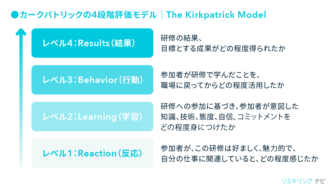 カークパトリックの四段階評価モデル(The Kirkpatrick Model)が有名です。このモデルを使うことで、受講者の反応、学習度、行動変容、結果に焦点を当てた評価が行えます。