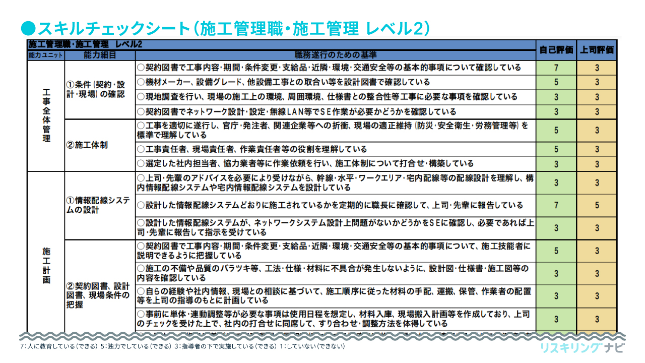 多くの場合、職種や階級ごとに必要な技能や経験、スキルを整理したシートを作成し、社員それぞれに対する自己評価や上司からの評価を記入します。