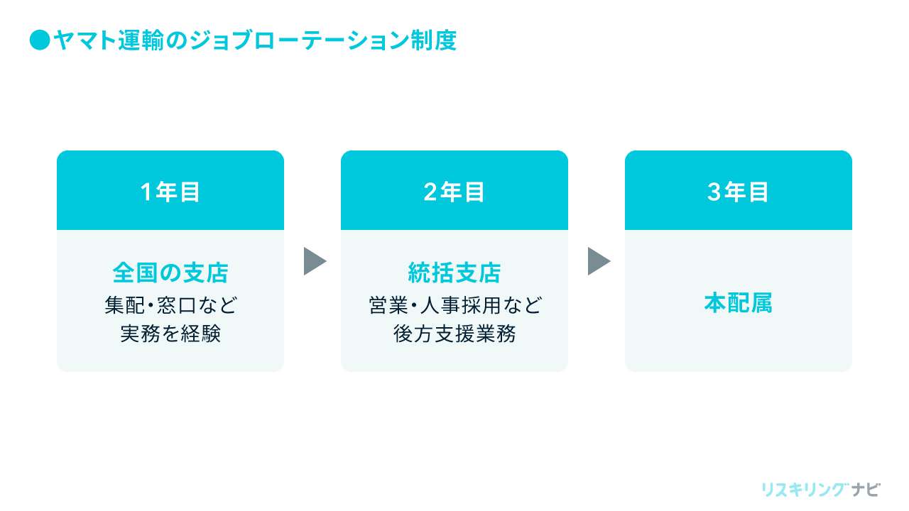 ジョブローテーションの成功事例で有名なのが、ヤマト運輸株式会社です。ヤマト運輸では、新入社員が2年を掛けて集配業務、コールセンター、営業業務、人事総務と幅広い業務を経験するジョブローテーション制度を導入しています。これにより、社員に会社全体の「仕事のつながり」を体感し、理解する機会を与えているのです。