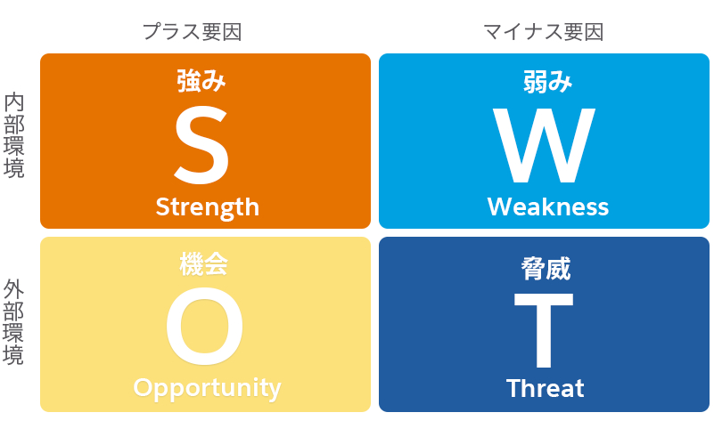 SWOT分析とは、「強み(Strength)」「弱み(Weakness)」「機会(Opportunity)」「脅威(Threat)」の頭文字をとったフレームワークのことです。内部環境と外部環境における自社の強みと弱みを客観的に分析でき、市場における立ち位置が明確になります。