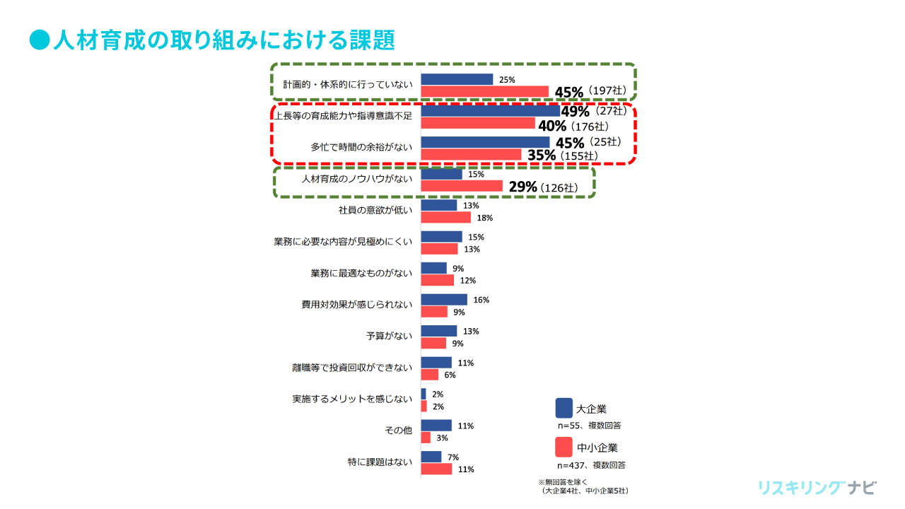 また、大企業・中小企業の両方で「上長等の育成能力や指導意識の不足」と「業務の多忙による時間の不足」が主な課題として挙げられています。中小企業では、「計画的・体系的な育成の欠如」は45%の企業で問題となっており、「人材育成のノウハウがない」と捉える企業も29%に上っています。