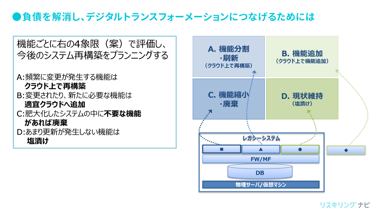 こうした仕分けを通じて、レガシーなシステムの技術的負債を解消することがDX推進のカギとなります。