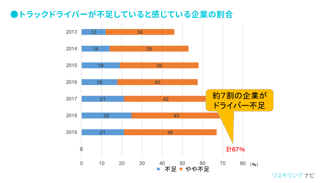 国土交通省が発表している「最近の物流政策について」(2021年1月22日)という資料によれば、2019年の時点で約70%の企業においてトラックドライバーが不足していることが分かっています。