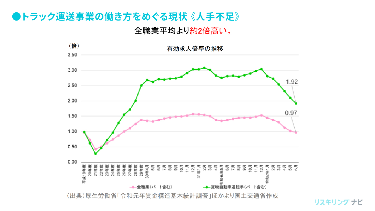 また、2020年6月時点での全職種平均の有効求人倍率が0.97倍であるのに対して、トラック運送業界は1.92倍となっていることからも、業界での人手不足が深刻であることが分かります。