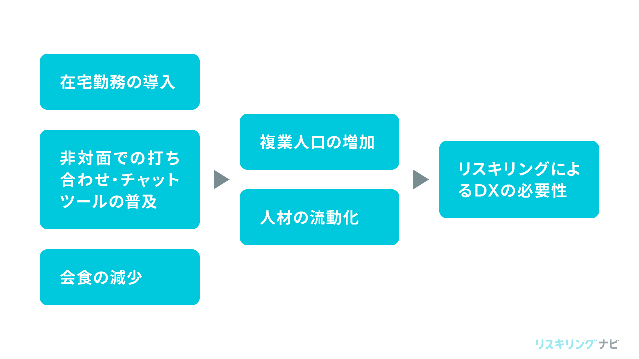 リスキリングが注目されている2つ目の理由は、「コロナ禍による働き方の変化」です。コロナ禍により、多くの企業で以下のような変化が起こりました。