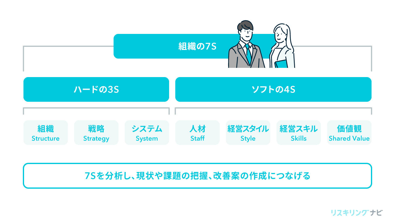 マッキンゼーの「7S」とは、マッキンゼー・アンド・カンパニーが提唱している組織の考え方で、ハード面に関わる「3S」とソフト面に関わる「4S」によって構成されています。