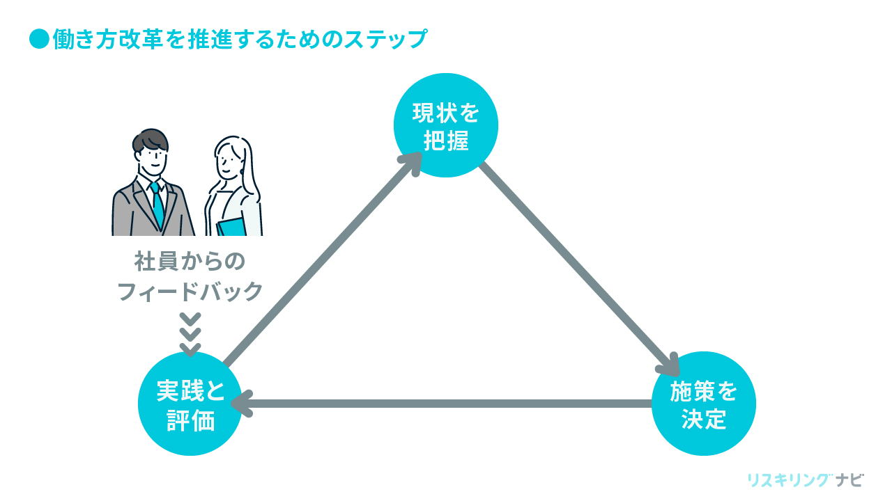 決定した施策を実行に移し、その成果を定期的に評価しましょう。働き方改革は継続的な取り組みですから、評価結果に基づきプロセスを見直し、必要に応じて調整します。この段階で、従業員からのフィードバックを積極的に取り入れることが肝心です。
