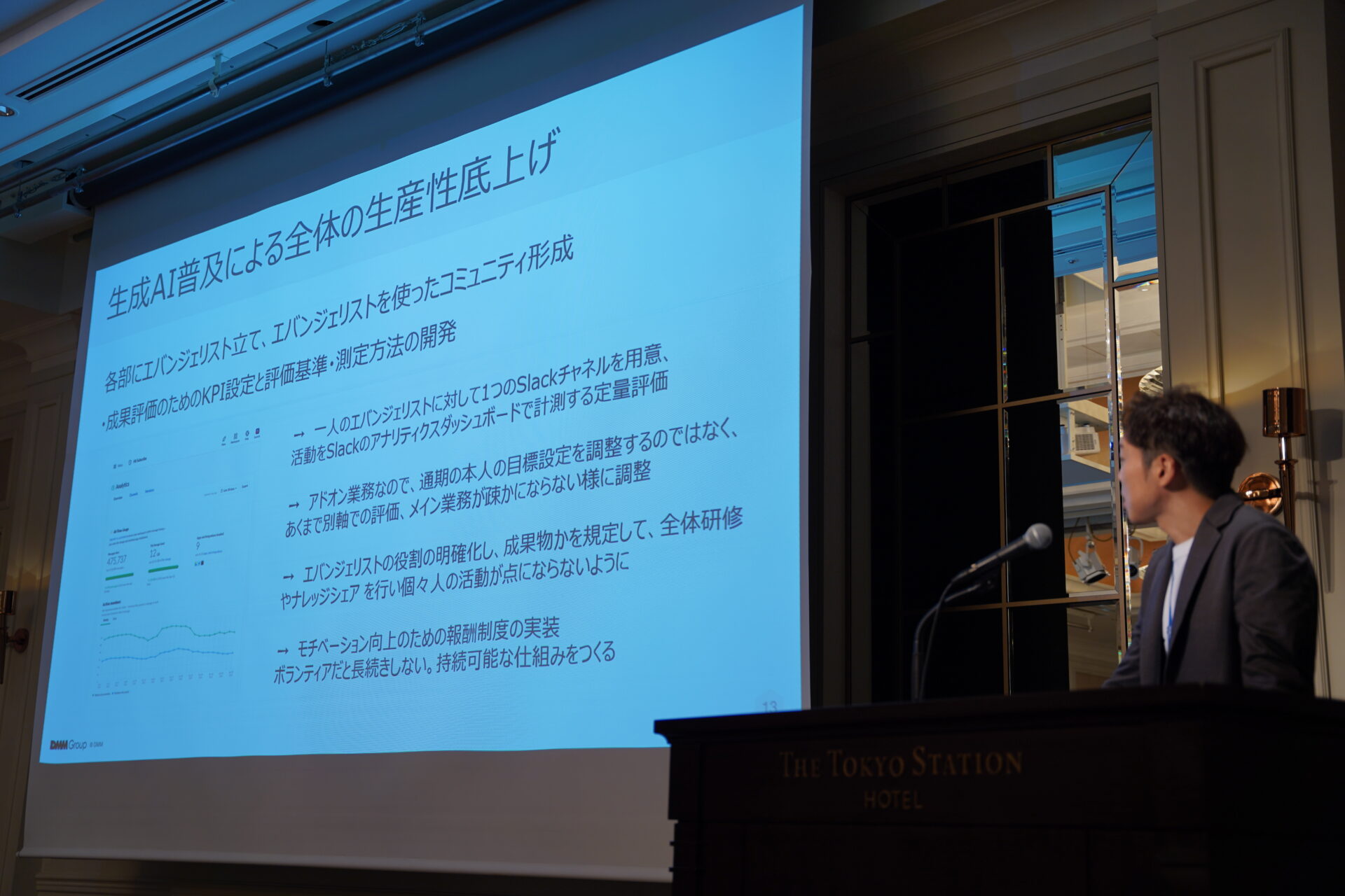 『AI人材として誰を育成すべきか』といった点については、生成AIをきちんと利活用している人間から選出しています。選出の基準は雇用形態を問いません。1日あたり生成AIに『何トーク消費したか』といったトーク数に基づき、公平に判断しています。 加えて自薦です。AI人材の育成は、興味をもつ人にやらせた方が成長が早いです。一方で中には実力が伴わない人もいるため、AIの利用実績によって見極めています。
