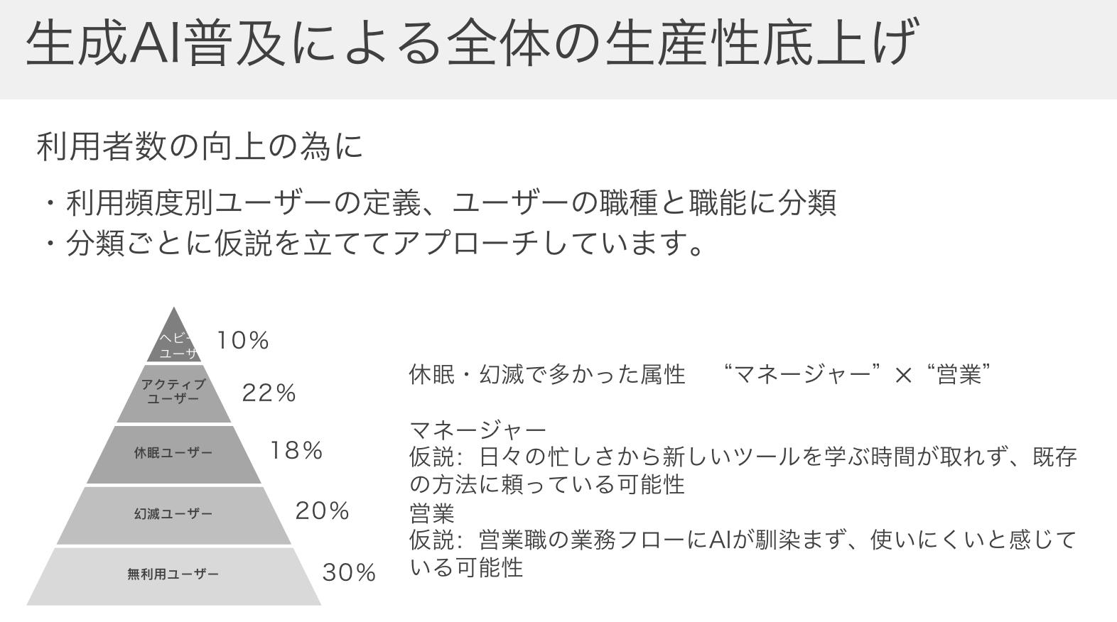 2つ目のポイントは『ユーザーの分類ごとにアプローチする方法』です。この方法はAIの利用頻度別にユーザーを定義し、ユーザーの職種と職能に分類します。分類ごとに仮説を立ててアプローチしています。分類は5階層のピラミッドであり、上位からヘビーユーザー、アクティブユーザー、休眠ユーザー、幻滅ユーザー、無利用ユーザーとなっています。休眠ユーザー、幻滅ユーザーの利用率をいかにして高めるかが、課題です。