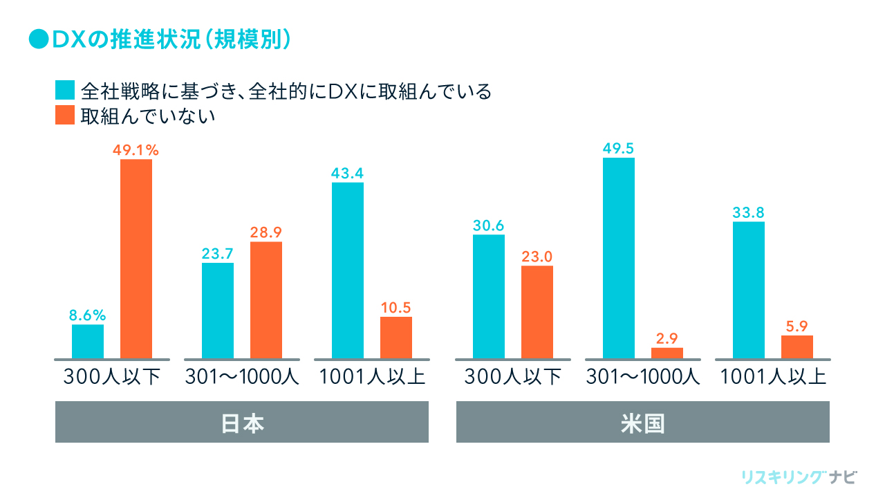 IPAが公開している『DX白書2021』によると、「全社戦略に基づき、全社的にDXに取組んでいる」と回答した企業は、大企業(従業員数1,001人以上)で43.4%だったのに対し、301人以上1,000人以下の企業では23.7%、300人以下の企業では8.6%となっており、大企業と中小企業の間でDXに関する意識の差が明確になっています。