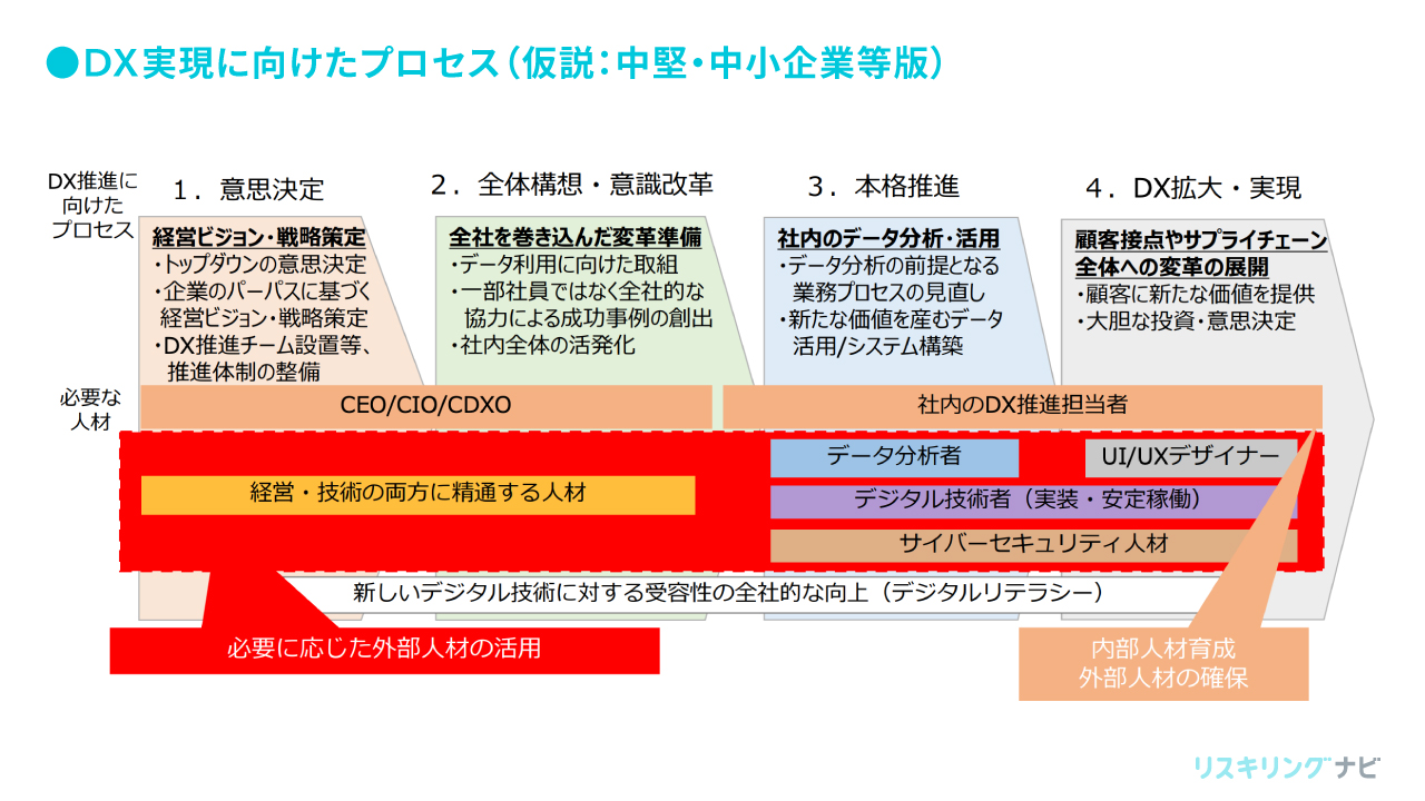 長期的な取り組みとなるため、外部人材の登用と同時に、内部人材の育成も進めておきたいところです。