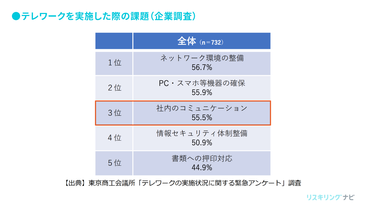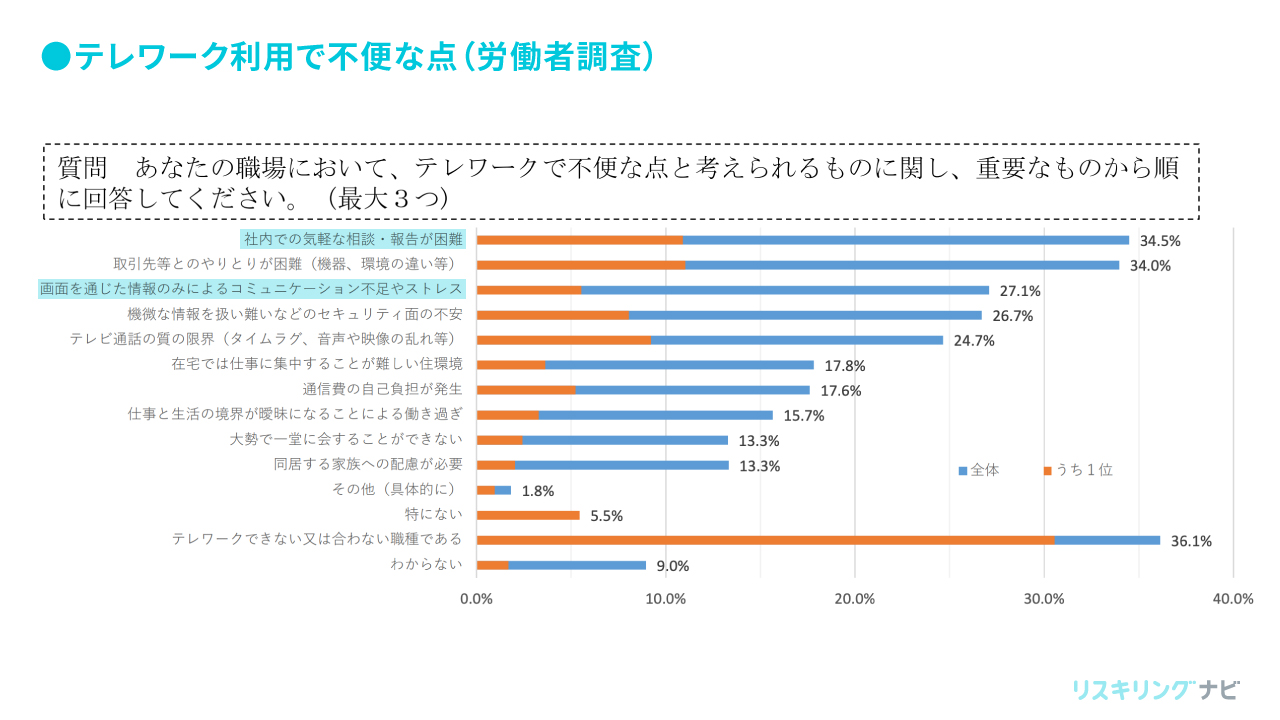 1つ目のメリットはコミュニケーションの活性化です。先ほど述べたように、リモートワークの導入によってコミュニケーション不足が起こりやすくなります。厚生労働省の第1回 「これからのテレワークでの働き方に関する検討会」(2020年8月)の参考資料「テレワークを巡る現状について」には、リモートワークの導入状況や課題が記されています。この資料によると、従業員側からは、リモートワークの不便な点として、「社内での気軽な相談・報告が困難」(34.5%)、「画面を通じた情報のみによるコミュニケーション不足やストレス」(27.1%)、企業側からはテレワークの課題として「社内のコミュニケーション」(55.5%)が挙げられています。