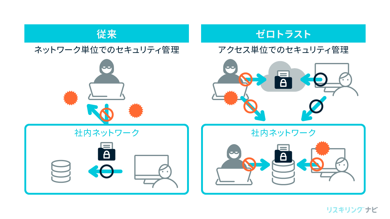 従来のセキュリティとゼロトラストセキュリティのおおまかな違いは、「従来のセキュリティはネットワーク単位、ゼロトラストセキュリティはアクセス単位で安全性を検証する」点にあります。