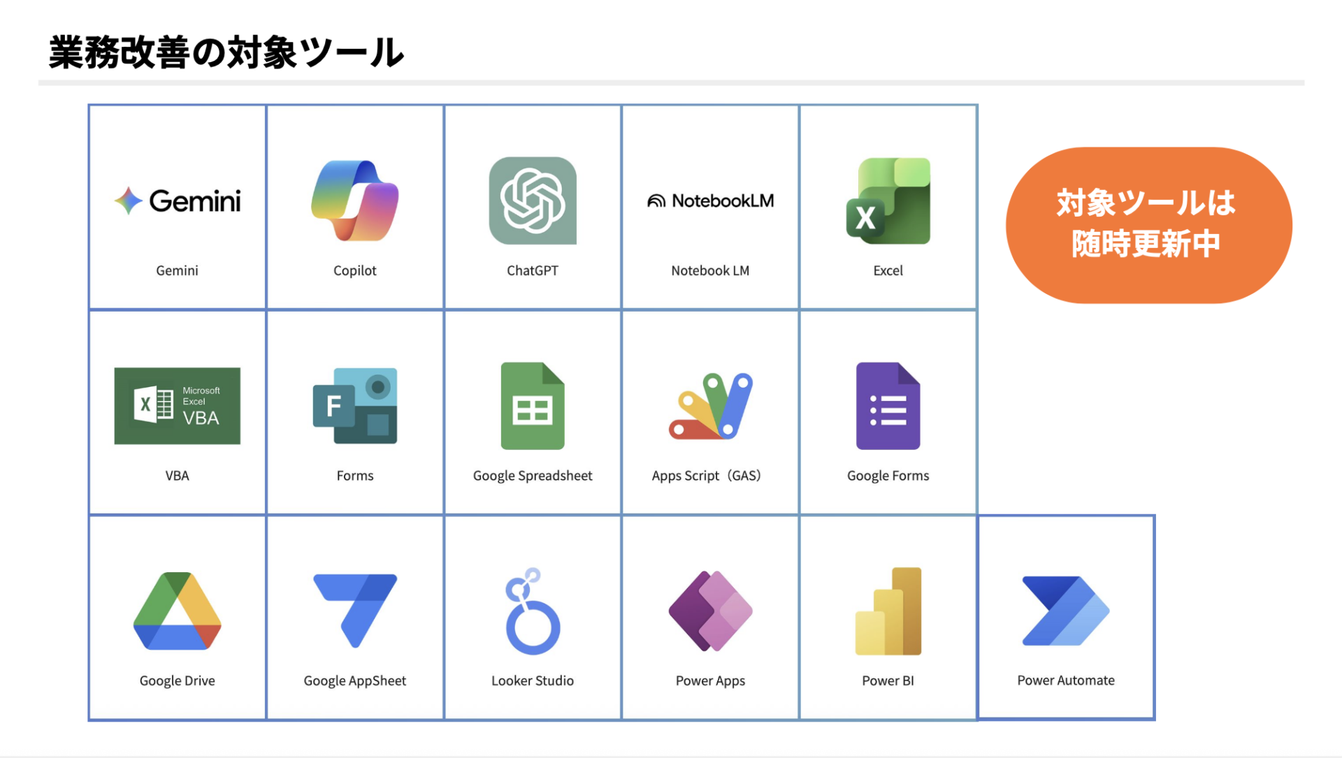生成AI(ChatGPT/Gemini/Copilot/NotebookLM)に加え、GAS/Looker Studio/Power BIなどを組み合わせて、現場の作業を「効率化→自動化→見える化」までつなげます。対象ツールは随時アップデートします。