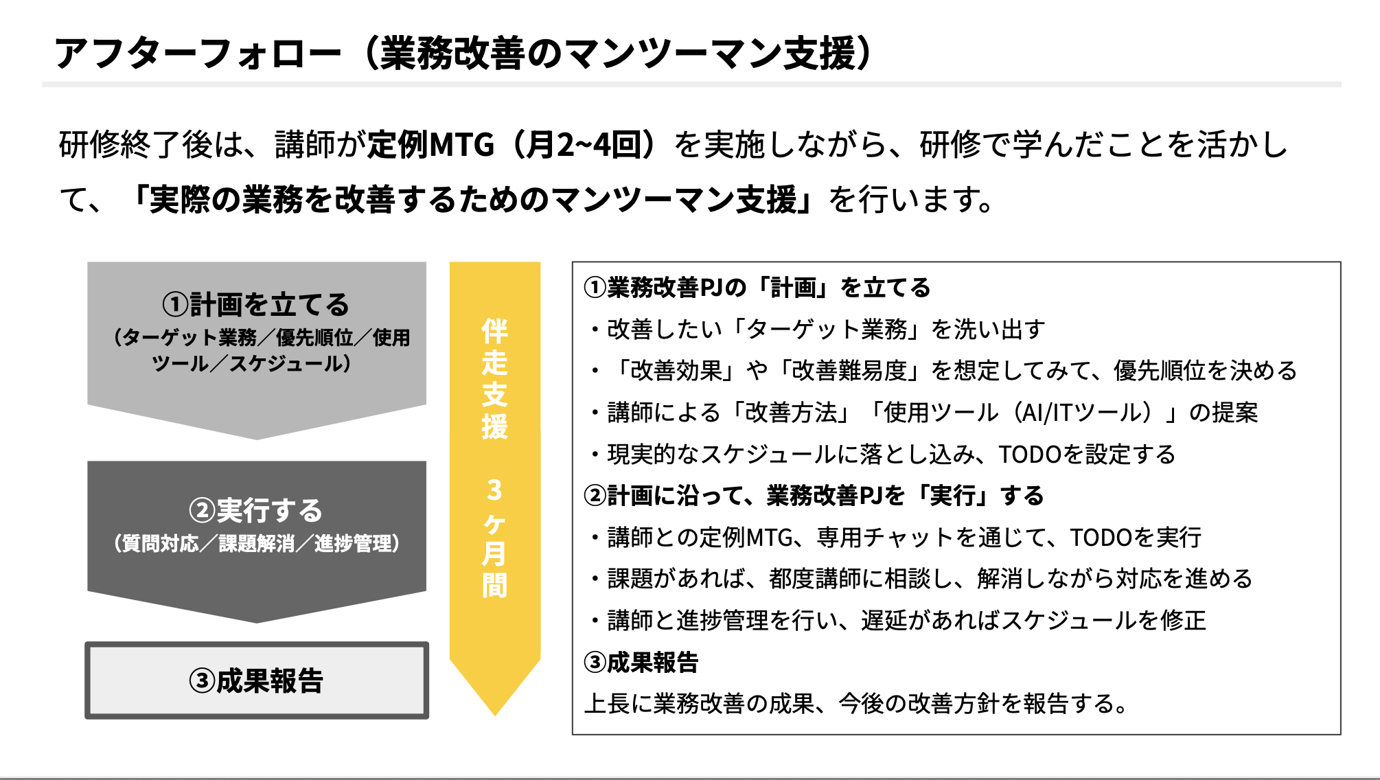 アフターフォロー:研修後3ヶ月の業務改善マンツーマン伴走